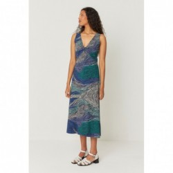 Mouwloze midi-jurk met een uitlopende pasvorm en V-hals. Gemakkelijk aan te trekken.