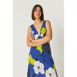 Mouwloze midi-jurk met een uitlopende pasvorm en V-hals. Gemakkelijk aan te trekken.