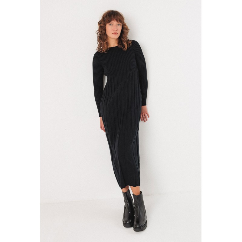 Lange, uitlopende gebreide jurk met geribbelde details. Gemaakt van halfdikke tricot, met een hoge hals en lange mouwen.