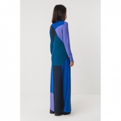 Lange, uitlopende gebreide jurk met contrasterende details. Gemaakt van halfdikke tricot, met een hoge hals en lange mouwen.