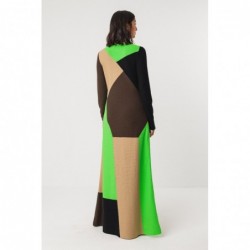 Lange, uitlopende gebreide jurk met contrasterende details. Gemaakt van halfdikke tricot, met een hoge hals en lange mouwen.