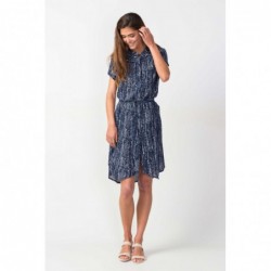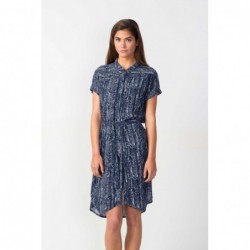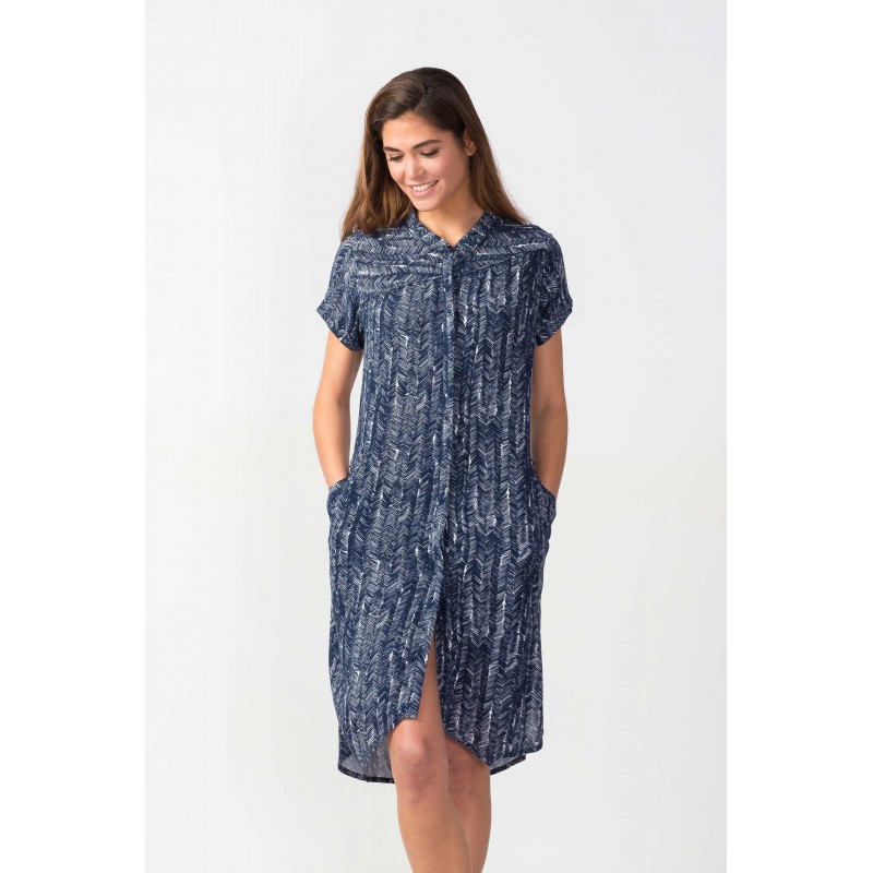 Rechte jurk met hoge hals. Met onze exclusieve handgetekende "zomer denim" print.