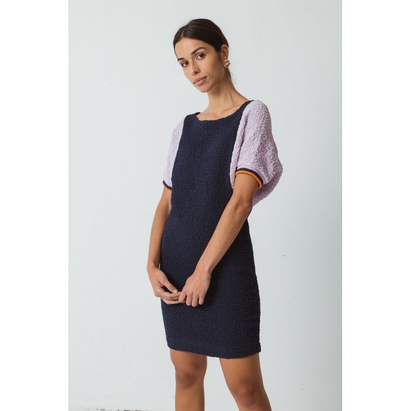Getailleerde jurk boven de knie. Ronde hals, vleermuismouwen. Gesmokte gebreide stof. Kleurblok met veelkleurige ribboord bij de hals.