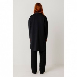 Een losvallende jurk die tot boven de knie valt, met een V-hals, lange mouwen, zakken aan de voorkant, een ritssluiting met twee richtingen en afgeronde zijsplitten aan de zoom.