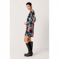 Rechte mini-jurk met ronde hals, lange pofmouwen en een druppelvormige rug. Bloemenprint.
