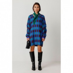 Korte A-lijn jurk met V-hals, lange raglanmouwen die tot aan de elleboog gerimpeld zijn, steekzakken aan de zijkant en zonder sluiting. Veelkleurige geometrische print.