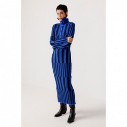 Lange gebreide maxi-jurk met opstaande kraag en geometrisch patroon. Samenwerking met Martina Spetlova. GOTS-gecertificeerd biologisch katoen.
