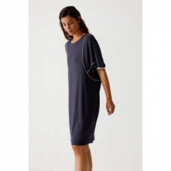 Losvallende jurk met driekwart vleermuismouwen en contrasterende biezen in een lichtgewicht stof. Vrouwelijke boothals en lengte tot onder de knie.