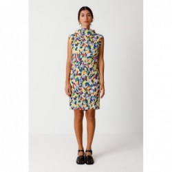 Elegante mouwloze jurk van fijne geplooide stof. Hoge hals en lengte boven de knie. Veelkleurige print.