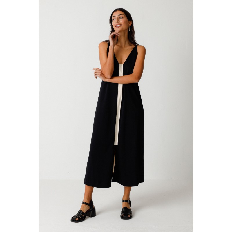 Mouwloze midi-jurk met een uitlopende snit. De jurk heeft een V-hals en een split aan de voorkant, en een contrasterend gekleurd detail aan de voorzijde en een ander aan de achterzijde.