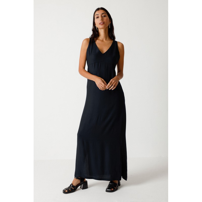 Elegante mouwloze maxi-jurk met een diepe V-hals en empiretaille. Aansluitend silhouet en zijsplitten voor extra bewegingsvrijheid.