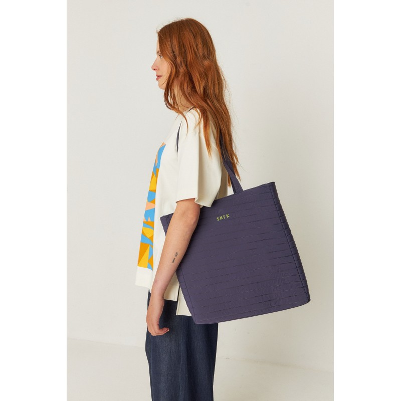 Gewatteerde tas met ritssluiting en lange hengsels. Diverse binnenvakken, waarvan één met rits. Afmetingen: 35 x 39 x 8 cm.