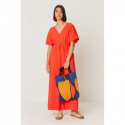 Bedrukte geplooide stoffen tas met twee handvatten. Volledig gevoerd en met drukknoopsluiting. Afmetingen: 30 x 40 cm.