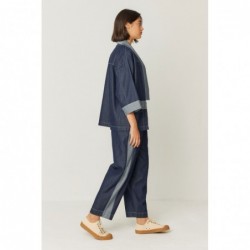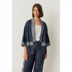 Jaqueta quimono jeans. Caimento solto, gola estilo smoking e mangas ¾. Esta jaqueta possui bolsos aplicados e viés contrastante que esconde as costuras internas.