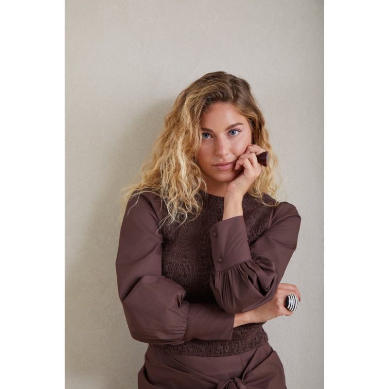 Blusa com corpete franzido. Mangas bufantes com punhos abotoados. Fechamento por botões nas costas. Botões forrados no mesmo tom. A Blusa Solana com Corpete é uma blusa versátil com um corpete franzido elástico que se ajusta ao corpo. As mangas bufantes com punhos abotoados adicionam um toque de sofisticação, enquanto o fechamento por botões nas costas facilita o uso. Perfeita para qualquer ocasião. Escolha seu tamanho habitual. A modelo tem 172 cm de altura e veste tamanho P. Você pode combinar esta blusa com a Saia Solana Knot.