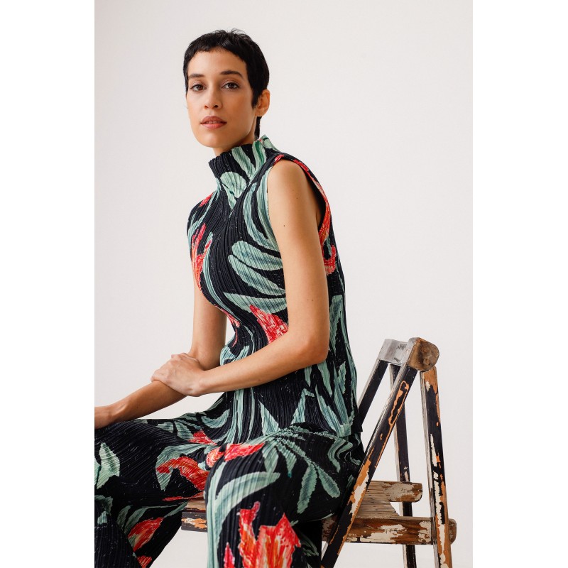 Uma blusa ajustada, sem mangas, com gola alta, confeccionada em tecido plissado fino e parcialmente forrada, com uma estética elegante e sofisticada.