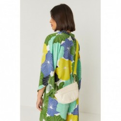 Bolsa acolchoada em formato de meia-lua com fecho de zíper, alça ajustável e bolsos internos, um deles com zíper. Mede 20 x 15 x 8 cm.