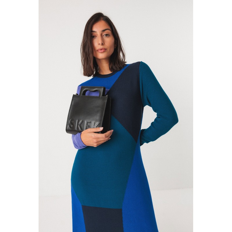 Bolsa quadrada com fecho magnético e dois bolsos internos. Pode ser carregada no ombro ou na mão graças à alça e alças ajustáveis. Dimensões: 19 x 19 x 8 cm.