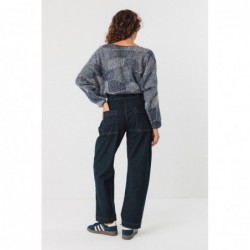 Calça jeans larga na altura do tornozelo, com zíper frontal e bolsos laterais.