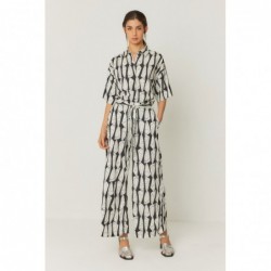 Calça palazzo com cós elástico, cinto para amarração e bolsos frontais.