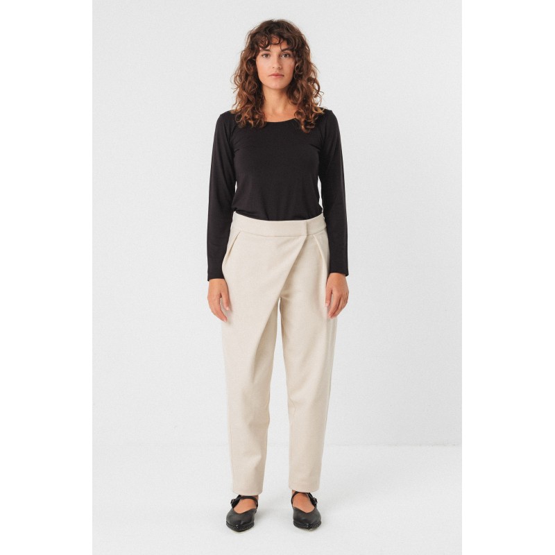 Calças compridas até o tornozelo com prega grande na frente. Zíper frontal e braguilha com botão, bolsos laterais e bolsos falsos atrás.