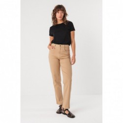 Calça reta confeccionada em algodão orgânico elástico. Fecho de zíper e bolsos frontais para as mãos.