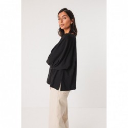 Camiseta folgada com gola redonda e mangas morcego. Detalhes plissados nos punhos e fendas laterais.