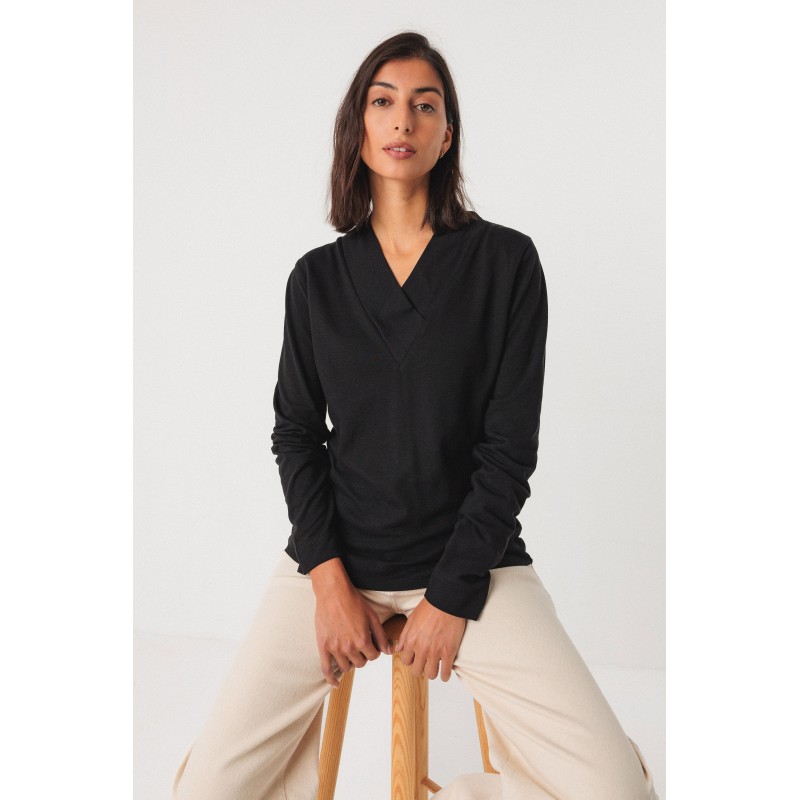 Camiseta de manga comprida com corte ajustado e decote em V com efeito drapeado.