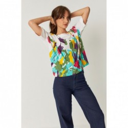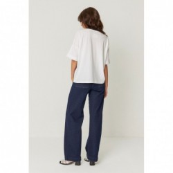 Camiseta folgada, com mangas 3/4, gola redonda, ombros caídos e forro de tecido nas pontas das mangas.