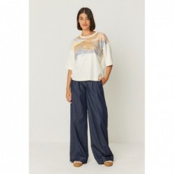 Lavagem a frio, ciclo delicado. Passar em temperatura baixa. Não usar alvejante. Não lavar a seco. Não secar na secadora. Lavar do avesso. Lavar com cores semelhantes. Passar do avesso. Não passar a estampa.