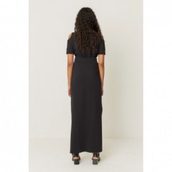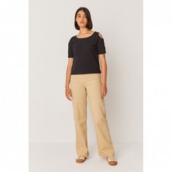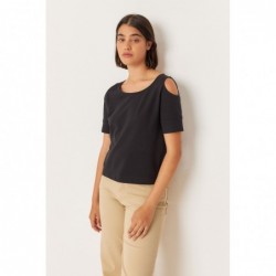 Camiseta de manga curta com fenda nos ombros. Corte reto e gola redonda.