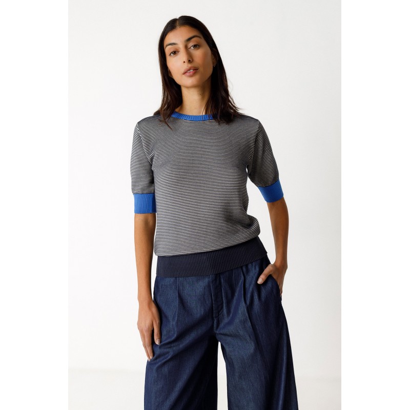 Suéter bicolor com efeito texturizado, confeccionado em malha leve de algodão orgânico com certificação GOTS. Possui gola redonda, mangas 3/4 e acabamento canelado na gola, punhos e barra.