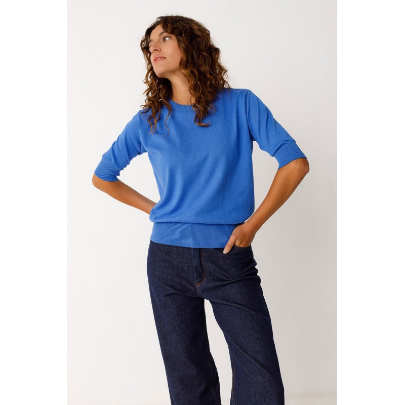 Suéter bicolor com efeito texturizado, confeccionado em malha leve de algodão orgânico com certificação GOTS. Possui gola redonda, mangas 3/4 e acabamento canelado na gola, punhos e barra.