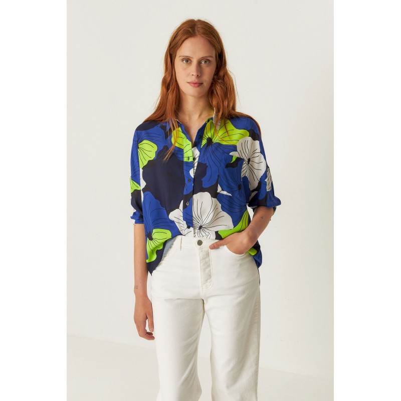 Camisa com bainha arredondada e mangas ¾. Gola clássica e abotoamento frontal.