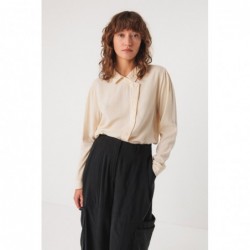 Camisa de corte reto com gola clássica e mangas compridas com fecho frontal assimétrico por botões.