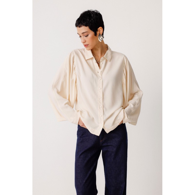Camisa de corte reto com gola, mangas morcego e fechamento frontal com botões, para um visual moderno e elegante.