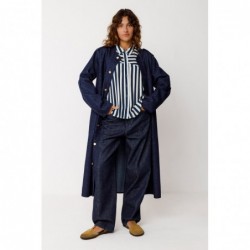Camisa de manga comprida com gola clássica, fechamento frontal com botões e barra arredondada mais comprida na parte de trás. Os botões ao longo de toda a manga podem ser desabotoados, revelando o braço.
