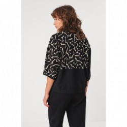 Camiseta folgada, de gola redonda, com mangas estilo morcego e patchwork contrastante.