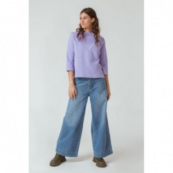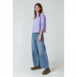 Camiseta de manga 3/4 com gola alta, feita de algodão orgânico elástico com textura otomana. O algodão orgânico é cultivado utilizando métodos e materiais que têm baixo impacto ambiental. Isso significa que não são utilizados fertilizantes ou pesticidas tóxicos e a fertilidade do solo é mantida. A modelo veste tamanho 38 e tem 1,73 m de altura.