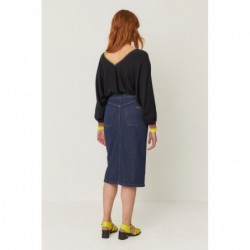 Suéter com mangas estilo asa de morcego e decote em V nas costas. Acabamento canelado no pescoço, cintura e punhos.