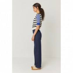 Suéter de gola redonda com mangas 3/4 e acabamento em malha canelada no pescoço, cintura e punhos.