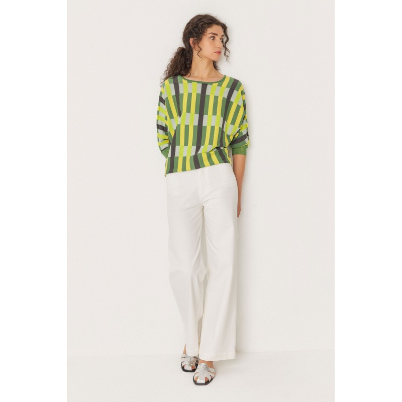 Suéter de algodão orgânico com mangas de morcego, gola redonda e acabamento canelado nas pontas das mangas.
