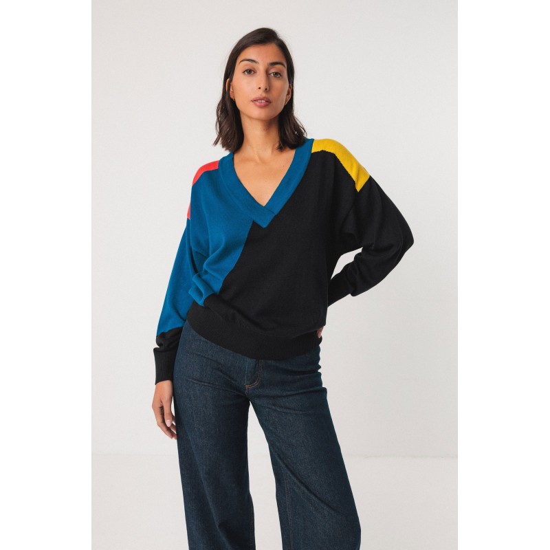 Suéter com decote em V, ombros caídos e mangas estilo morcego. Feito em malha fina com efeito de cor contrastante.
