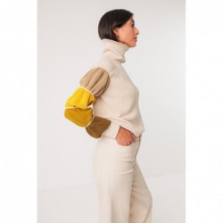 Um suéter de malha semi-grossa e ajustado, com gola alta canelada e mangas compridas. É adornado com um esquema de cores contrastantes.