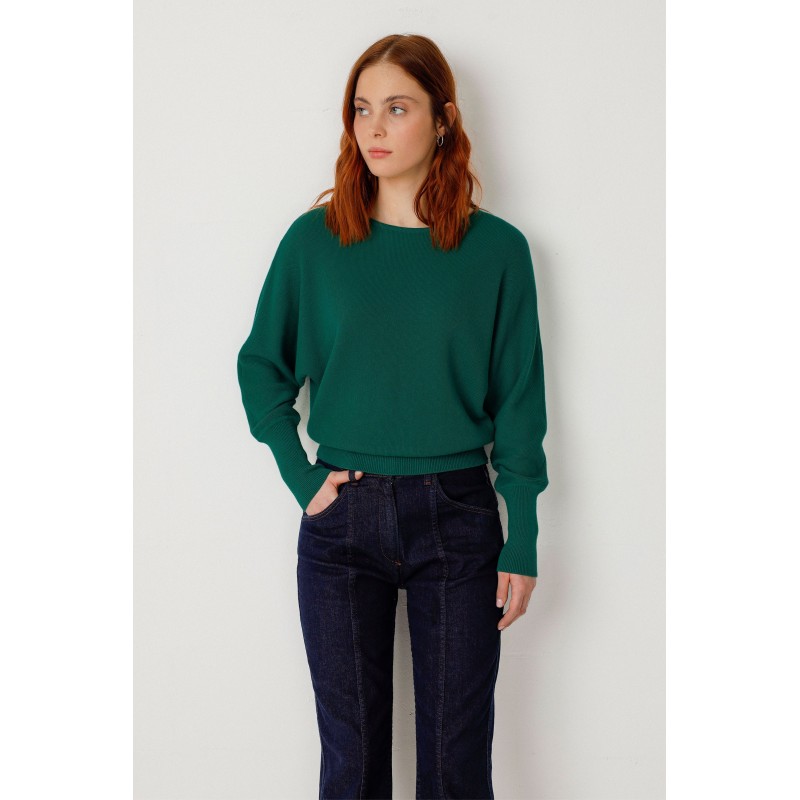 Suéter de gola redonda e mangas dolmã com textura de bolinhas. Uma peça confortável e casual, sem fecho. Algodão orgânico com certificação GOTS.