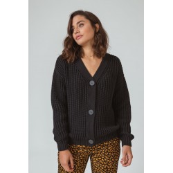 Suéter de manga comprida com decote em V, feito de malha grossa de algodão orgânico certificado pela GOTS e FAITRADE®. De cor preta. Ser certificado é uma sensação ótima. O Comércio Justo® é uma forma de fazer negócios que garante que os agricultores na origem do nosso algodão recebam um pagamento justo; Também lhes concede subsídios para desenvolver projetos comunitários. O GOTS é reconhecido como o principal padrão global para processamento de têxteis feitos de fibras orgânicas. A modelo veste tamanho 38 e tem 1,74 m de altura.