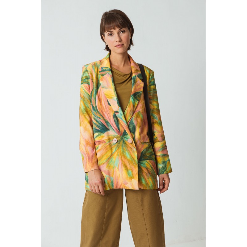 Blazer solto e de corte reto, com fecho de botões duplos e bolsos frontais. Confeccionado em viscose fluida Ecovero. Estampa multicolorida. A viscose LENZING ECOVERO é produzida com métodos ecologicamente responsáveis. Feita com madeira e polpa de madeira provenientes de florestas manejadas de forma sustentável, sua produção gera 50% menos gases de efeito estufa e consome metade da água.