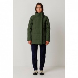 Jaqueta acolchoada na altura da coxa com modelagem regular, gola alta, mangas compridas, bolsos embutidos e fechamento frontal com zíper oculto. Possui capuz embutido na gola com ajuste por cordão elástico, é totalmente forrada e impermeável.