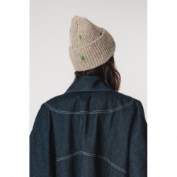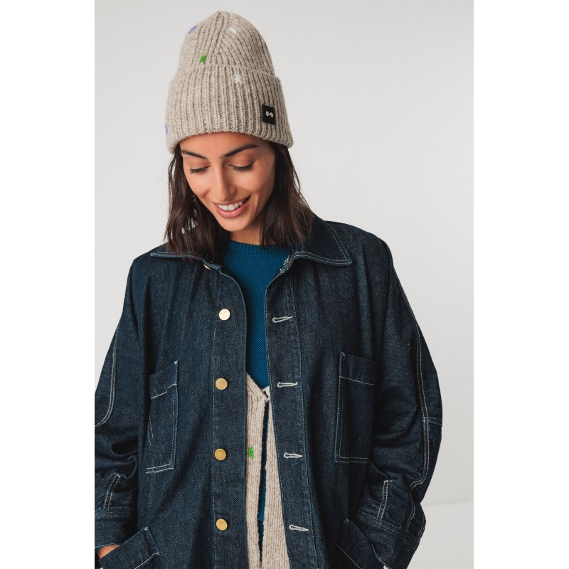 Gorro em malha de lã merino premium com aplique decorativo na lateral. Fabricado em Portugal.