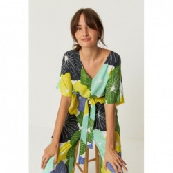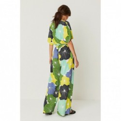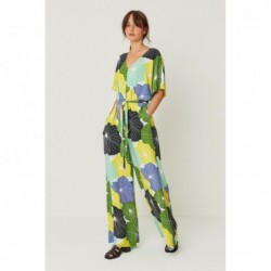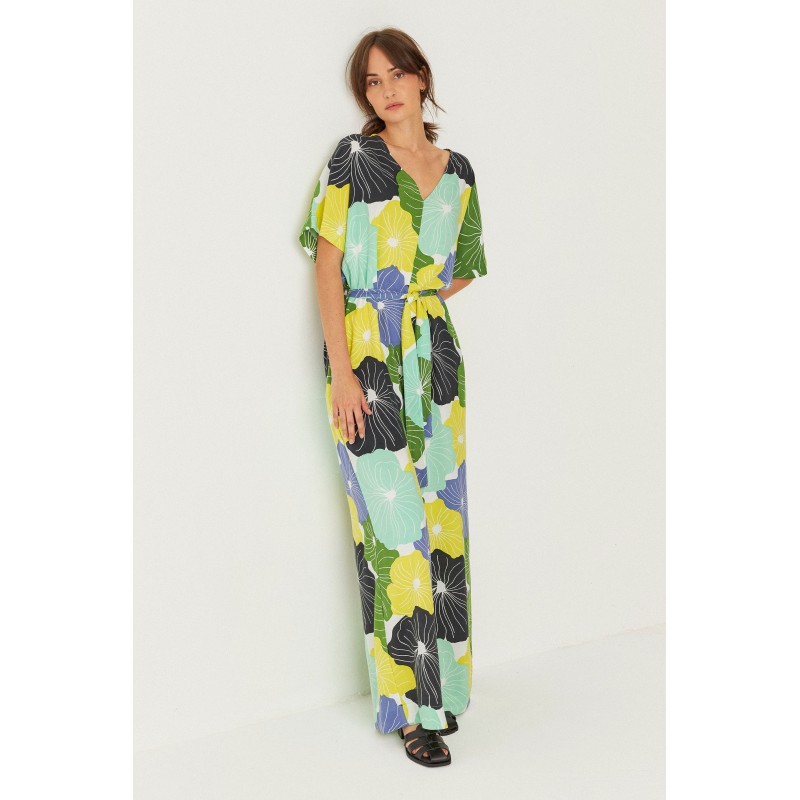 Macacão folgado com mangas curtas tipo dolman. Decote em V profundo e bolsos laterais.